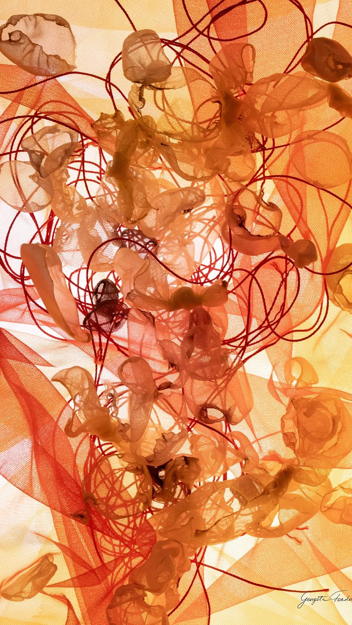 Georgeta Fondos is a multidisciplinary artist working in experimental textile art, textile-based photography, and bespoke mural painting. Her practice is defined by innovative methods and materials, including the use of flame to scorch synthetic fabrics. She creates immersive textile installations, intricate wall-based artworks, and photographic pieces on ChromaLuxe aluminum that highlight the raw beauty of scorched textile forms.